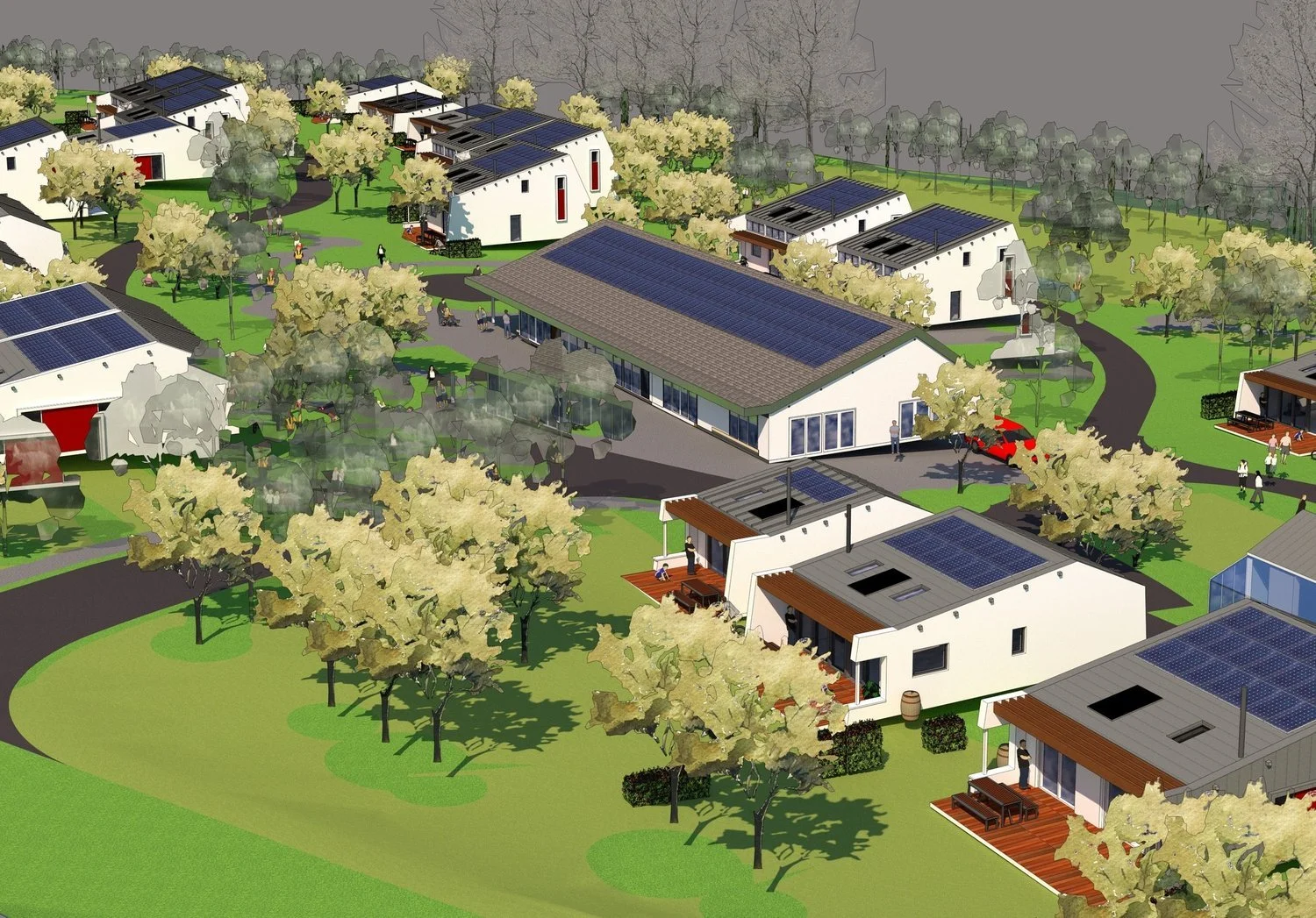 “Full planning permission for 17unit mixed detached and semi-detached residential houses alongside a 32unit cohousing development. The cohousing development will consist of a mix of unit sizes from 1 to 4 bedroom, detached, semi-detached and terraced, a common house (consisting of a kitchen, function/dining room, two bedrooms & office, as a focal point of the neighbourhood & communal meals once per week) with extensive shared green spaces, play areas, shared gardens & wildlife areas.”